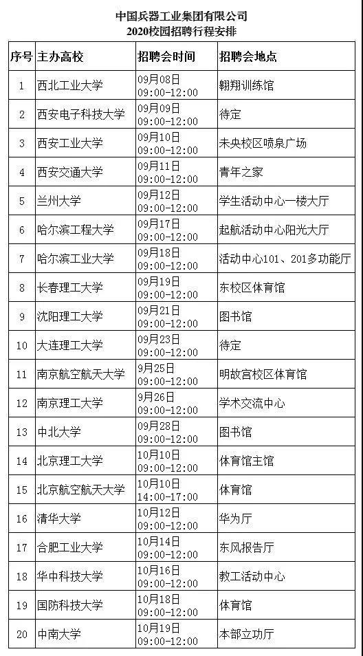 中國(guó)兵器工業(yè)集團(tuán) 2020校園招聘火熱來(lái)襲 只等你來(lái)哦 有夢(mèng)想的青年,請(qǐng)往下面看 讓我們攜手強(qiáng)軍報(bào)國(guó) 公司簡(jiǎn)介 我們是我軍機(jī)械化、信息化、智能化裝備發(fā)展的骨干 我們是全軍毀傷打擊的核心支撐 我們是現(xiàn)代化新型陸軍體系作戰(zhàn)能力科研制造的主體 我們是國(guó)家“一帶一路”建設(shè)和軍民融合發(fā)展的主力 我們就是 中國(guó)兵器工業(yè)集團(tuán) 我們闊步邁進(jìn)世界一流防務(wù)集團(tuán) 資產(chǎn)總額3960億元 世界500強(qiáng)企業(yè)排名140 中國(guó)制造業(yè)企業(yè)排名第9 連續(xù)15年獲國(guó)資委經(jīng)營(yíng)業(yè)績(jī)考核A級(jí) 招聘信息 面對(duì)2020年離開(kāi)校園的你們,我們準(zhǔn)備了 >>職位:1500余個(gè) >>招聘人數(shù):3774人 >>專(zhuān)業(yè)涉及: 武器類(lèi) 武器系統(tǒng)與發(fā)射工程,彈藥工程與爆炸技術(shù),探測(cè)制導(dǎo)與控制技術(shù)等 機(jī)械類(lèi) 機(jī)械設(shè)計(jì)制造及其自動(dòng)化,車(chē)輛工程,工程力學(xué),機(jī)械電子工程等 電子類(lèi) 電氣工程及其自動(dòng)化,電子信息工程,通信工程,儀器儀表工程等 材料類(lèi) 金屬材料工程,材料成型及控制工程,高分子材料與工程,材料科學(xué)與工程等 計(jì)算機(jī)類(lèi) 計(jì)算機(jī)科學(xué)與技術(shù),計(jì)算機(jī)系統(tǒng)結(jié)構(gòu),計(jì)算機(jī)軟件與理論,網(wǎng)絡(luò)工程等 經(jīng)管類(lèi) 財(cái)務(wù)管理,工商管理,行政管理,人力資源管理,會(huì)計(jì)學(xué),審計(jì)學(xué)等 其他 環(huán)境與安全類(lèi),臨床醫(yī)學(xué),語(yǔ)言類(lèi),建筑學(xué),法學(xué),采礦工程,化學(xué)類(lèi)等 行程安排 中國(guó)兵器工業(yè)集團(tuán)2020屆校園招聘會(huì)將在全國(guó)12個(gè)城市、20所高校舉辦,招聘會(huì)具體行程見(jiàn)下表: