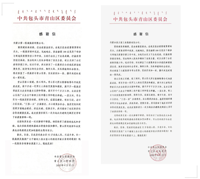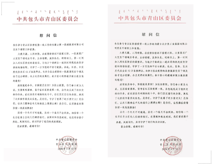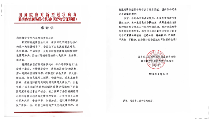 近日,中國兵器工業(yè)集團(tuán)豫西集團(tuán)鄭州紅宇專汽公司、一機(jī)集團(tuán)和北重集團(tuán)分別收到國務(wù)院應(yīng)對新型冠狀病毒肺炎疫情聯(lián)防聯(lián)控機(jī)制醫(yī)療物資保障組,包頭市青山區(qū)委、區(qū)政府發(fā)來的感謝信、慰問信,對他們在打贏疫情防控人民戰(zhàn)爭、總體戰(zhàn)、阻擊戰(zhàn)中作出的貢獻(xiàn)表示感謝。 豫西集團(tuán)鄭州紅宇專汽公司收到國務(wù)院聯(lián)防聯(lián)控機(jī)制感謝信 4月14日,國務(wù)院應(yīng)對新型冠狀病毒肺炎疫情聯(lián)防聯(lián)控機(jī)制醫(yī)療物資保障組向中國兵器工業(yè)集團(tuán)豫西集團(tuán)鄭州紅宇專汽公司發(fā)來感謝信。 豫西集團(tuán)鄭州紅宇專汽公司收到國務(wù)院應(yīng)對新型冠狀病毒肺炎疫情聯(lián)防聯(lián)控機(jī)制醫(yī)療物資保障組發(fā)來的感謝信 信中指出,新冠肺炎疫情發(fā)生以來,在以習(xí)近平同志為核心的黨中央堅(jiān)強(qiáng)領(lǐng)導(dǎo)下,全國上下各條戰(zhàn)線緊急動員、各司其職、主動擔(dān)責(zé),及時采取有效措施遏制疫情擴(kuò)散蔓延勢頭,堅(jiān)決打好疫情防控的人民戰(zhàn)爭、總體戰(zhàn)、阻擊戰(zhàn)。 特別是在醫(yī)療物資保供戰(zhàn)中,鄭州紅宇專汽公司牢固樹立“生命重于泰山、疫情就是命令、防控就是責(zé)任”的思想,第一時間響應(yīng)國家號召,積極履行社會責(zé)任,識大體、顧大局,努力克服用工短缺、物流停運(yùn)、成本上漲等困難,在疫情防控的關(guān)鍵時期連續(xù)超負(fù)荷生產(chǎn),出色完成了國務(wù)院聯(lián)防聯(lián)控機(jī)制醫(yī)療物資保障組下達(dá)的醫(yī)療廢物轉(zhuǎn)運(yùn)車生產(chǎn)任務(wù),有力保障了全國特別是湖北武漢等重點(diǎn)地區(qū)的疫情防控需求。公司全體員工舍小家為大家、爭分奪秒、加班加點(diǎn),夜以繼日奮戰(zhàn)在生產(chǎn)保供一線,用自己特有的方式支持疫情防控,為打贏疫情防控阻擊戰(zhàn)作出了突出貢獻(xiàn)。 鄭州紅宇專汽公司緊急生產(chǎn)醫(yī)療廢物轉(zhuǎn)運(yùn)車并及時發(fā)運(yùn) 疫情發(fā)生以來,鄭州紅宇專汽公司已簽約醫(yī)療廢物轉(zhuǎn)運(yùn)車107臺,累計(jì)下線90臺,交付83臺。 一機(jī)集團(tuán)和北重集團(tuán)收到中共包頭市青山區(qū)委員會、青山區(qū)人民政府發(fā)來的感謝信和慰問信 4月13日,中共包頭市青山區(qū)委員會、青山區(qū)人民政府向中國兵器工業(yè)集團(tuán)一機(jī)集團(tuán)和北重集團(tuán)發(fā)來感謝信和慰問信,對參與青山區(qū)防控疫情一線工作的一機(jī)集團(tuán)、北重集團(tuán)黨員干部職工及給予充分理解、全力支持的家屬們,表示衷心的感謝并致以最崇高的敬意!