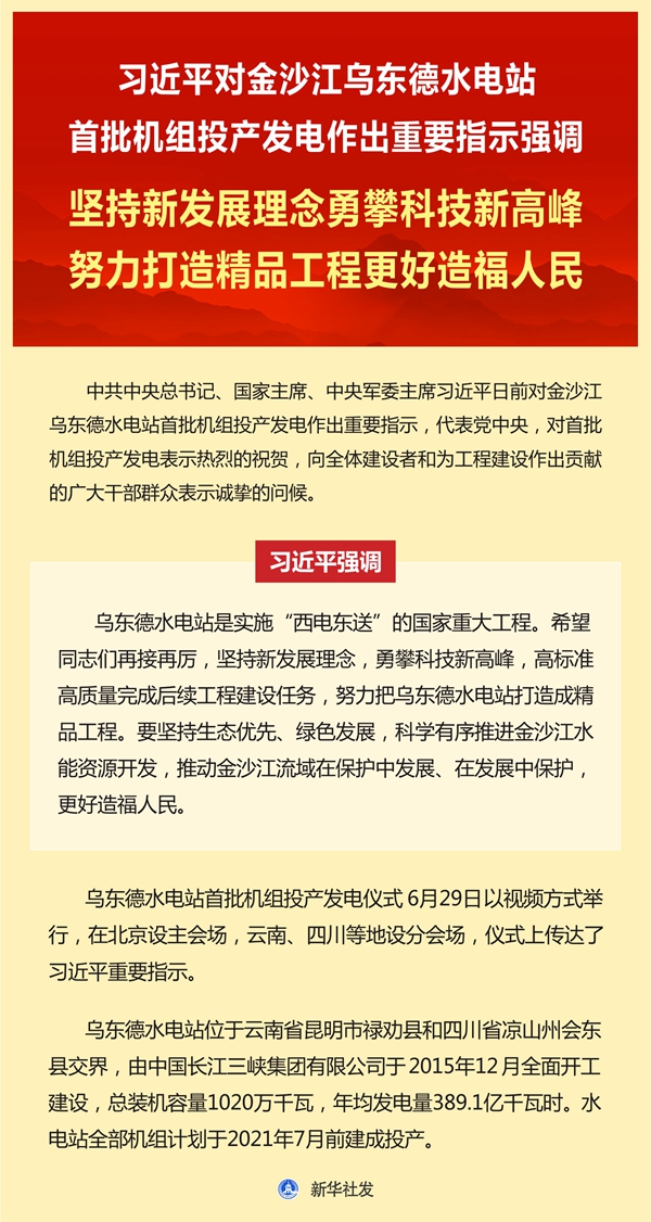 新華社北京6月29日電 中共中央總書(shū)記、國(guó)家主席、中央軍委主席習(xí)近平日前對(duì)金沙江烏東德水電站首批機(jī)組投產(chǎn)發(fā)電作出重要指示,代表黨中央,對(duì)首批機(jī)組投產(chǎn)發(fā)電表示熱烈的祝賀,向全體建設(shè)者和為工程建設(shè)作出貢獻(xiàn)的廣大干部群眾表示誠(chéng)摯的問(wèn)候。 習(xí)近平強(qiáng)調(diào),烏東德水電站是實(shí)施“西電東送”的國(guó)家重大工程。希望同志們?cè)俳釉賲?,?jiān)持新發(fā)展理念,勇攀科技新高峰,高標(biāo)準(zhǔn)高質(zhì)量完成后續(xù)工程建設(shè)任務(wù),努力把烏東德水電站打造成精品工程。要堅(jiān)持生態(tài)優(yōu)先、綠色發(fā)展,科學(xué)有序推進(jìn)金沙江水能資源開(kāi)發(fā),推動(dòng)金沙江流域在保護(hù)中發(fā)展、在發(fā)展中保護(hù),更好造福人民。 烏東德水電站首批機(jī)組投產(chǎn)發(fā)電儀式29日以視頻方式舉行,在北京設(shè)主會(huì)場(chǎng),云南、四川等地設(shè)分會(huì)場(chǎng),儀式上傳達(dá)了習(xí)近平重要指示。 烏東德水電站位于云南省昆明市祿勸縣和四川省涼山州會(huì)東縣交界,由中國(guó)長(zhǎng)江三峽集團(tuán)有限公司于2015年12月全面開(kāi)工建設(shè),總裝機(jī)容量1020萬(wàn)千瓦,年均發(fā)電量389.1億千瓦時(shí)。水電站全部機(jī)組計(jì)劃于2021年7月前建成投產(chǎn)。