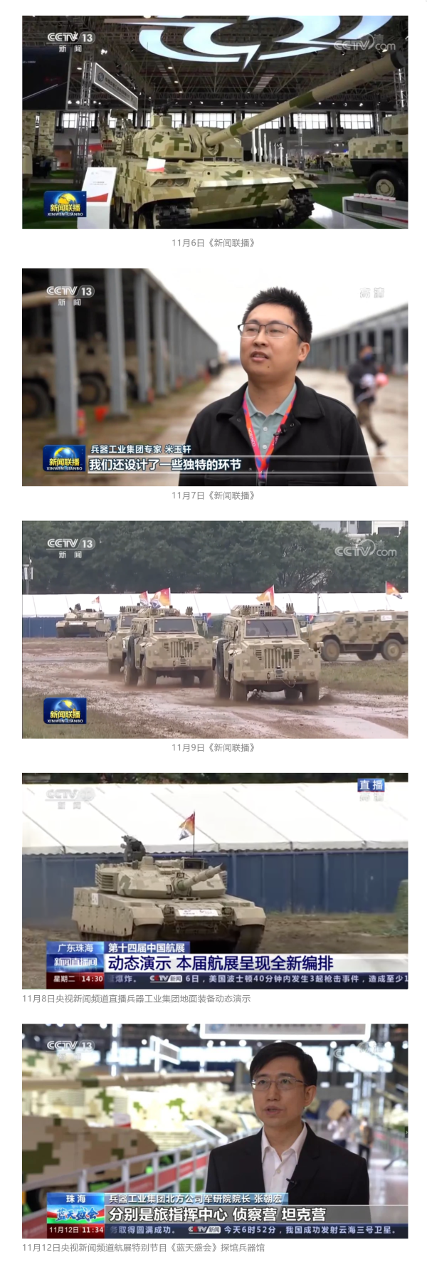 11月6日、7日、9日,央視《新聞聯(lián)播》三次報(bào)道兵器工業(yè)集團(tuán)參展情況,重點(diǎn)介紹了集團(tuán)公司總體參展情況、地面裝備動(dòng)態(tài)演示全新編排、國(guó)產(chǎn)輪式反伏擊車(chē)首次采用有人駕駛和無(wú)人駕駛混合編隊(duì)等內(nèi)容。11月8日,央視新聞?lì)l道直播地面裝備動(dòng)態(tài)演示;11月12日,央視新聞?lì)l道航展特別報(bào)道《藍(lán)天盛會(huì)》探訪兵器館,采訪兵器工業(yè)集團(tuán)嘉賓對(duì)陸軍合成旅作了報(bào)道。