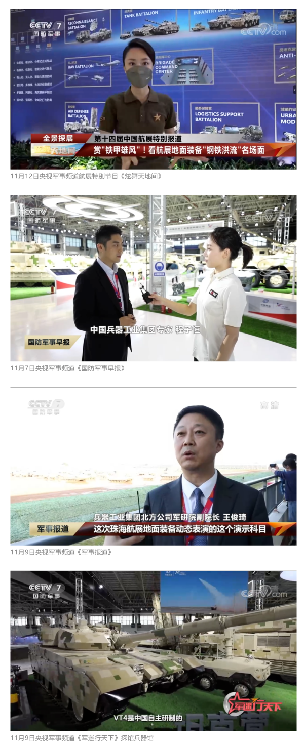 央視國(guó)防軍事頻道航展特別報(bào)道《炫舞天地間》11月12日《賞“鐵甲雄風(fēng)”!看航展地面裝備“鋼鐵洪流”名場(chǎng)面》對(duì)兵器工業(yè)集團(tuán)武器裝備特色亮點(diǎn)進(jìn)行報(bào)道?!秶?guó)防軍事早報(bào)》11月7日推出報(bào)道《第十四屆中國(guó)國(guó)際航空航天博覽會(huì)明天開(kāi)幕 中國(guó)兵器館首次以陸軍合成旅實(shí)戰(zhàn)體系形式展出》,對(duì)兵器館陸軍合成旅實(shí)戰(zhàn)體系進(jìn)行報(bào)道?!盾娛聢?bào)道》11月9日推出《第十四屆中國(guó)國(guó)際航空航天博覽會(huì) 地面兵器裝備首次聯(lián)合陸航直升機(jī)進(jìn)行動(dòng)態(tài)展示》報(bào)道?!盾娒孕刑煜隆?1月9日推出報(bào)道《軍迷打卡航展2022》以專(zhuān)業(yè)軍迷視角探館兵器館,全面展示兵器工業(yè)集團(tuán)參展裝備特色亮點(diǎn)。