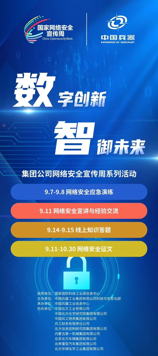 9月11日至17日,中國兵器工業(yè)集團(tuán)有限公司以“數(shù)字創(chuàng)新 智御未來”為主題,圍繞集團(tuán)公司“1+5”戰(zhàn)略和“雙十”規(guī)劃,組織開展集團(tuán)公司網(wǎng)絡(luò)安全宣傳周系列活動。