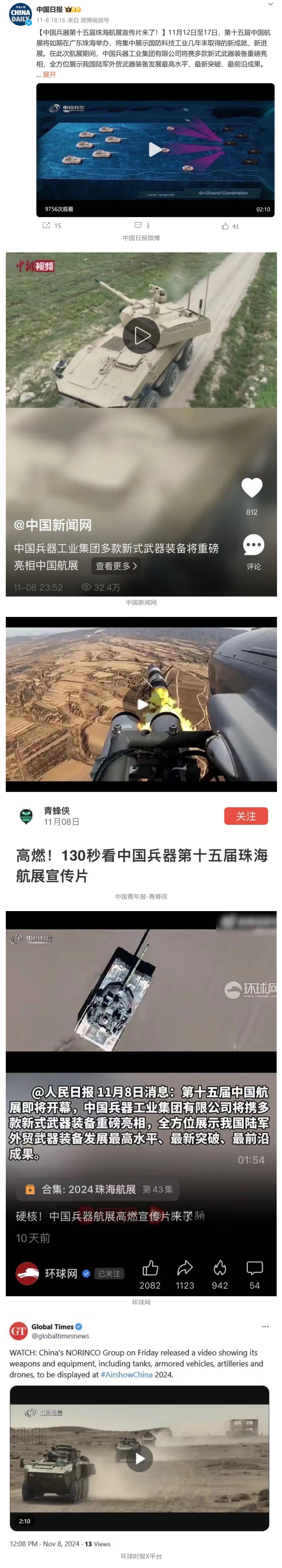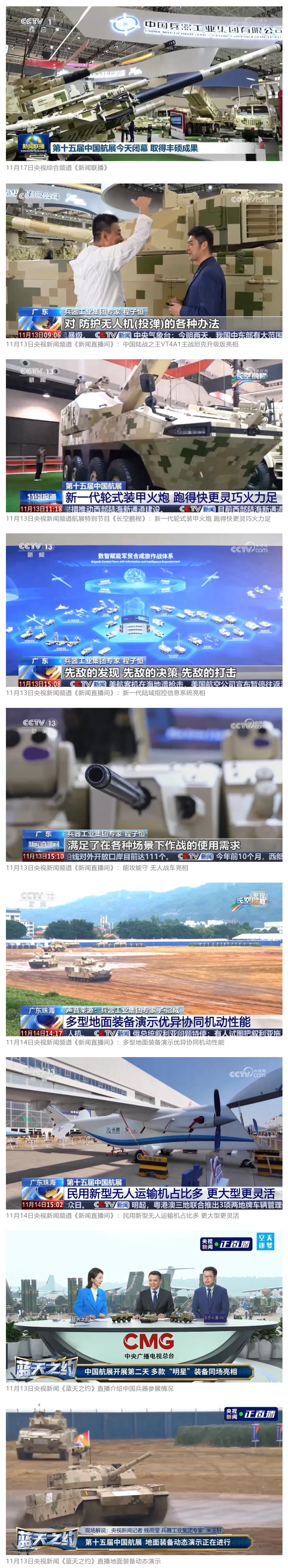 11月13日央視新聞《藍天之約》直播地面裝備動態(tài)演示此次航展,央視綜合頻道《新聞聯(lián)播》《晚間新聞》、新聞頻道《新聞直播間》《新聞30分》《朝聞天下》《共同關(guān)注》《東方時空》《午夜新聞》、財經(jīng)頻道《天下財經(jīng)》《經(jīng)濟信息聯(lián)播》《正點財經(jīng)》《第一時間》、中文國際頻道《今日環(huán)球》《中國新聞》、國防軍事頻道《軍事報道》《正午國防軍事》《國防軍事早報》《軍迷行天下》等欄目共播出兵器工業(yè)集團參展相關(guān)新聞報道40余條。11月10日央視新聞頻道《新聞30分》11月10日央視中文國際頻道《中國新聞》11月10日央視國防軍事頻道《軍事報道》11月11日央視國防軍事頻道《正午國防軍事》