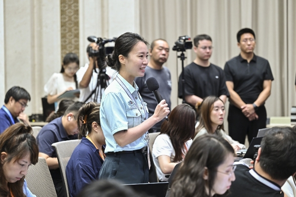 8月20日,國務院新聞辦公室在北京舉行新聞發(fā)布會,閱兵領導小組辦公室副主任、中央軍委聯(lián)合參謀部作戰(zhàn)局少將副局長吳澤棵,中國人民解放軍中部戰(zhàn)區(qū)閱兵指揮機構辦公室常務副主任、政治工作部少將副主任徐貴忠介紹閱兵準備工作有關情況,并答記者問。這是記者在現(xiàn)場提問。